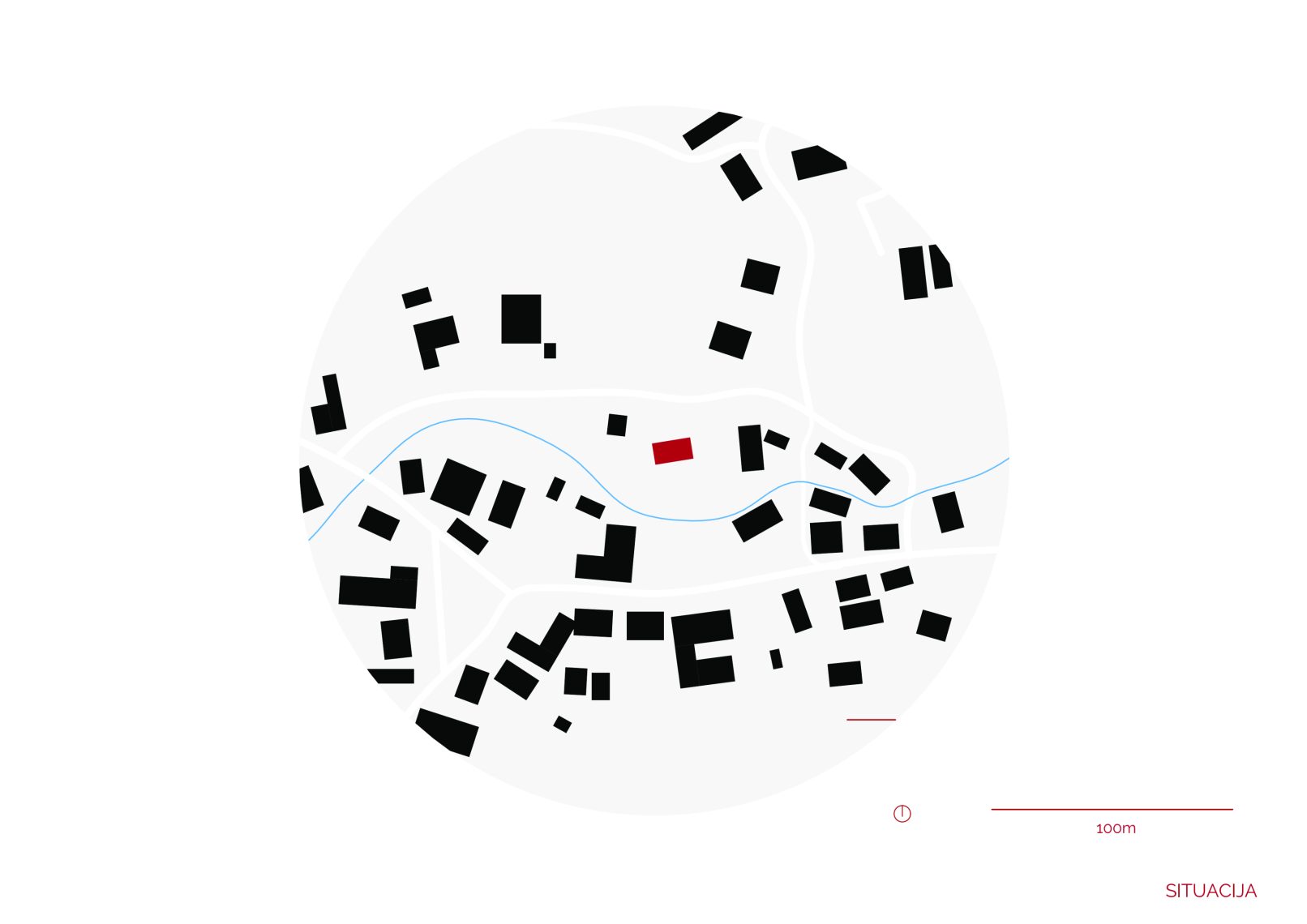 Enostanovanjska hiša za štiričlansko družino je umeščena v središče trškega središča vasi Motnik, tik ob potoku Motniščica. Hiša s pomožnim objektov je zaradi poplavne nevarnosti dvignjena nad koto terena.