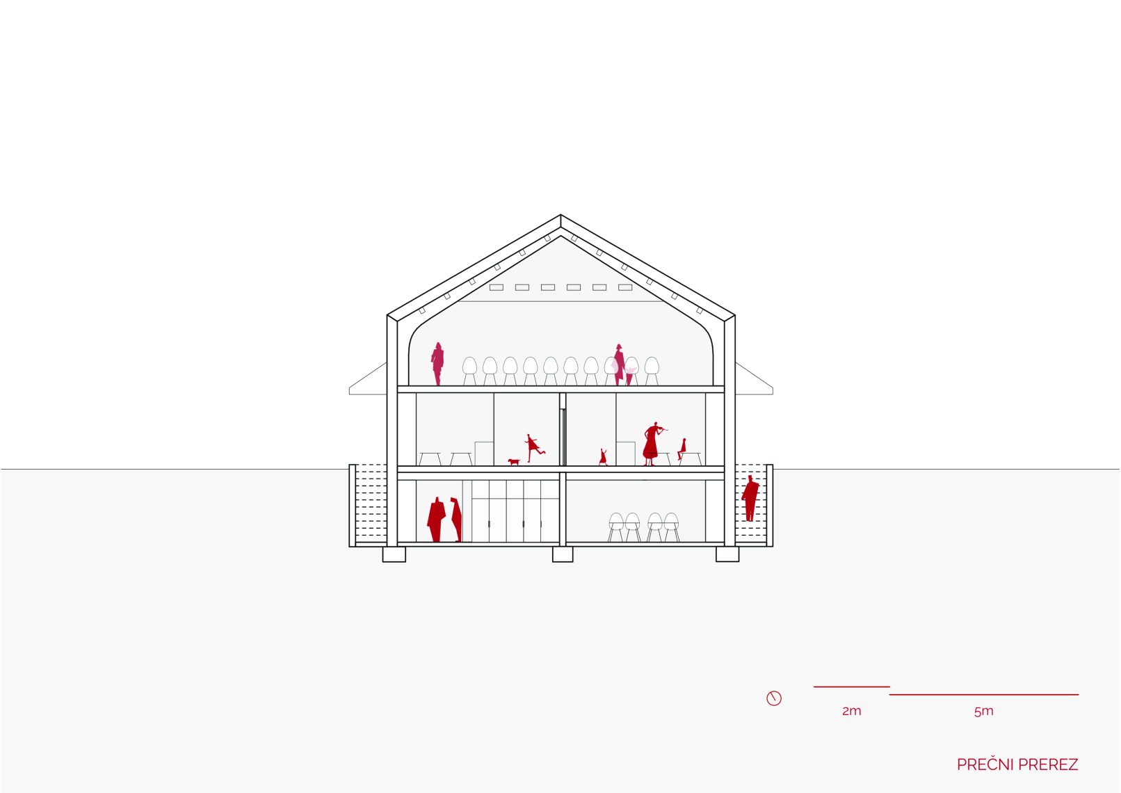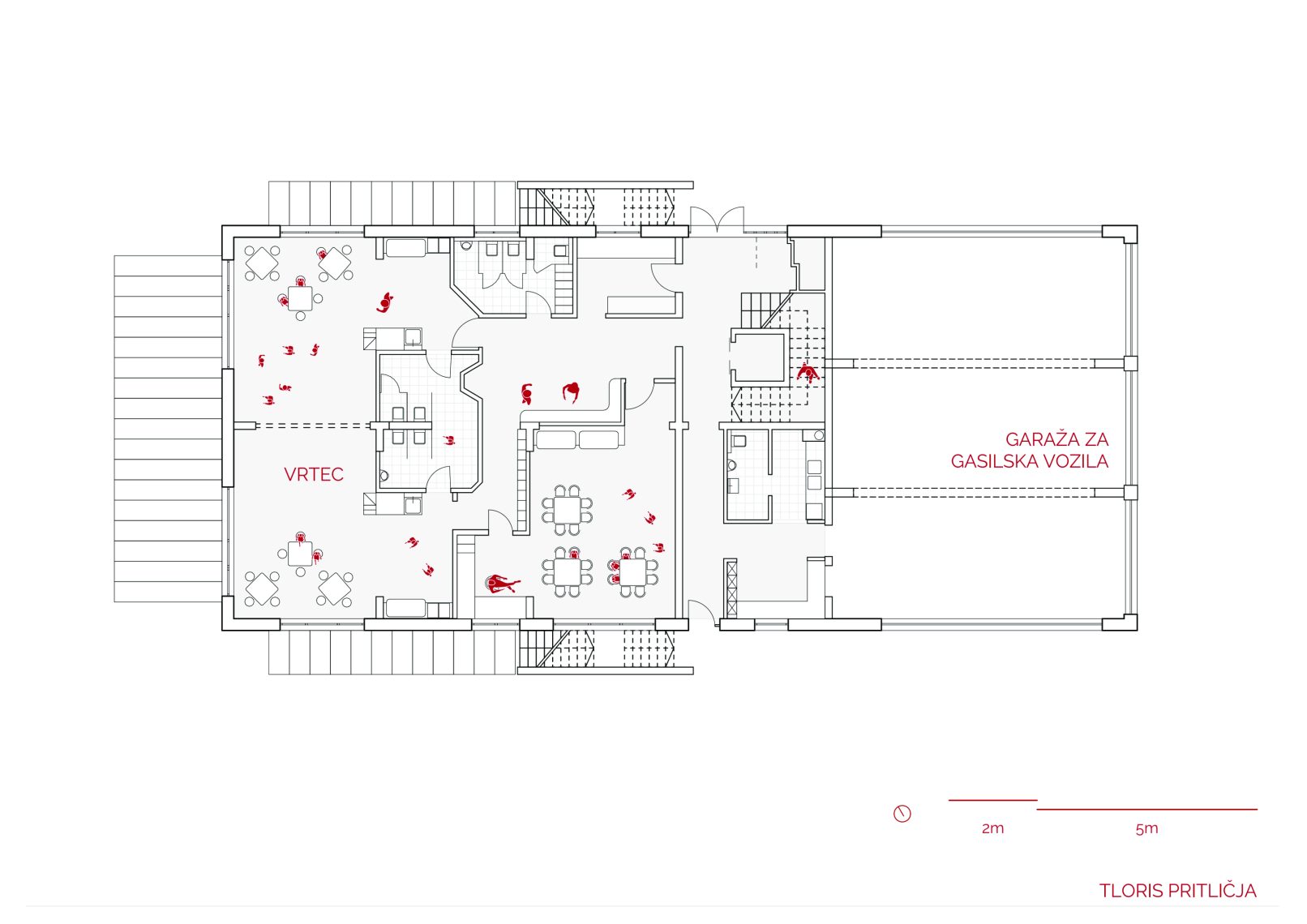 Na vzhodni strani je objekt enoetažen z ravno streho (za zunanje igrišče uporabno pohodno teraso). Na zahodni strani je objekt v celoti podkleten in je namenjen društvenim prostorom PGD Dob. Pritličje zaseda gasilka garaža za tri vozila in vrtec, ki ima prostore za tri oddelke predšolske vzgoje. Vrtec ima tudi zunanji atrij za prvo starostno skupino, obenem pa uporablja zunanje zelene površine, ki so sicer v domeni prostovoljnega gasilskega društva. V mansardi je večnamenska dvorana, ki je v dopoldanskem času v uporabi vrtca, sicer pa je namenjena interesnim dejavnostim krajanov.