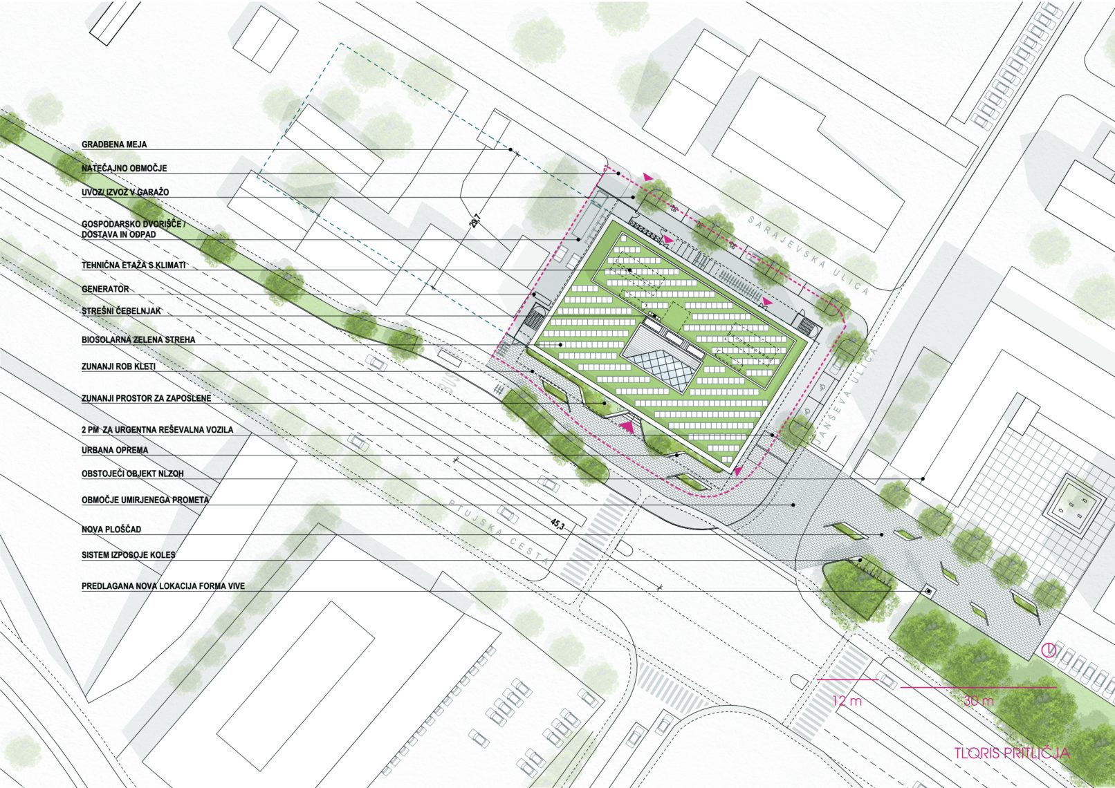 Javni prostor je zasnovan mestotvorno in vzpostavlja novo središče dogajanja za severni del mestne četrti Tezno. Na stičišču Ptujske ceste in Janševe ulice smo predvideli ploščad, ki povezuje zunanja parterja obeh stavb NLZOH. V sklopu ureditve ploščadi predlagamo podaljšek zelene bariere severno od Ptujske ceste do križišča ter nadaljevanje zelene poteze do parterja novega objekta. Predlagamo premik obstoječe skulpture Forma Viva japonskega kiparja Banza Matsuure iz leta 1977 na rob ploščadi, s prenovo ter ureditvijo zelenega območja.