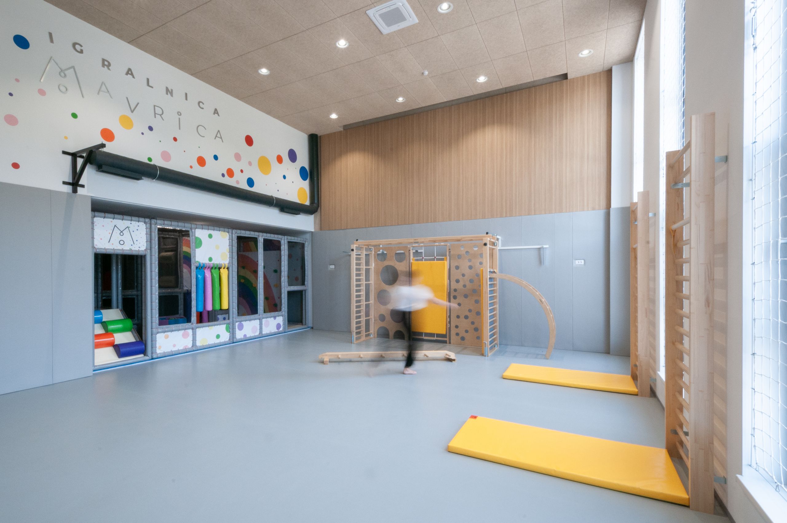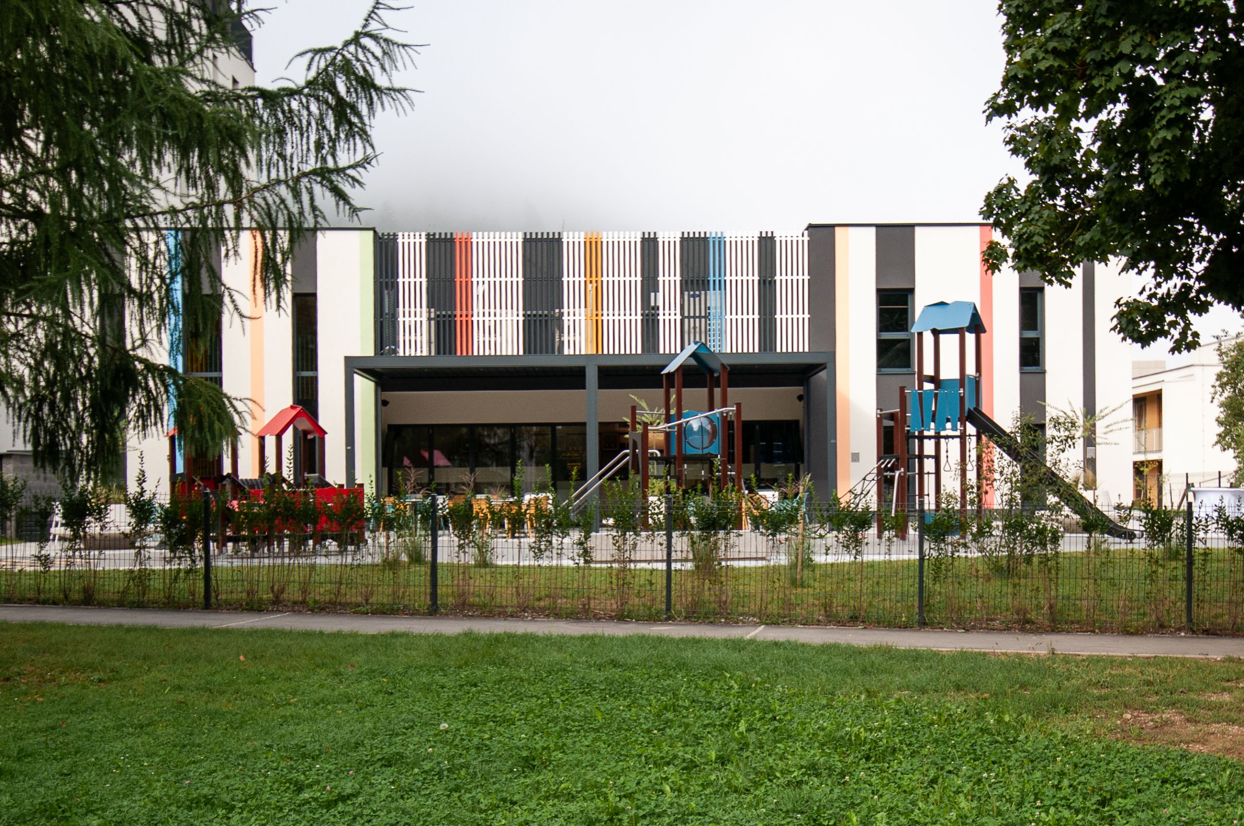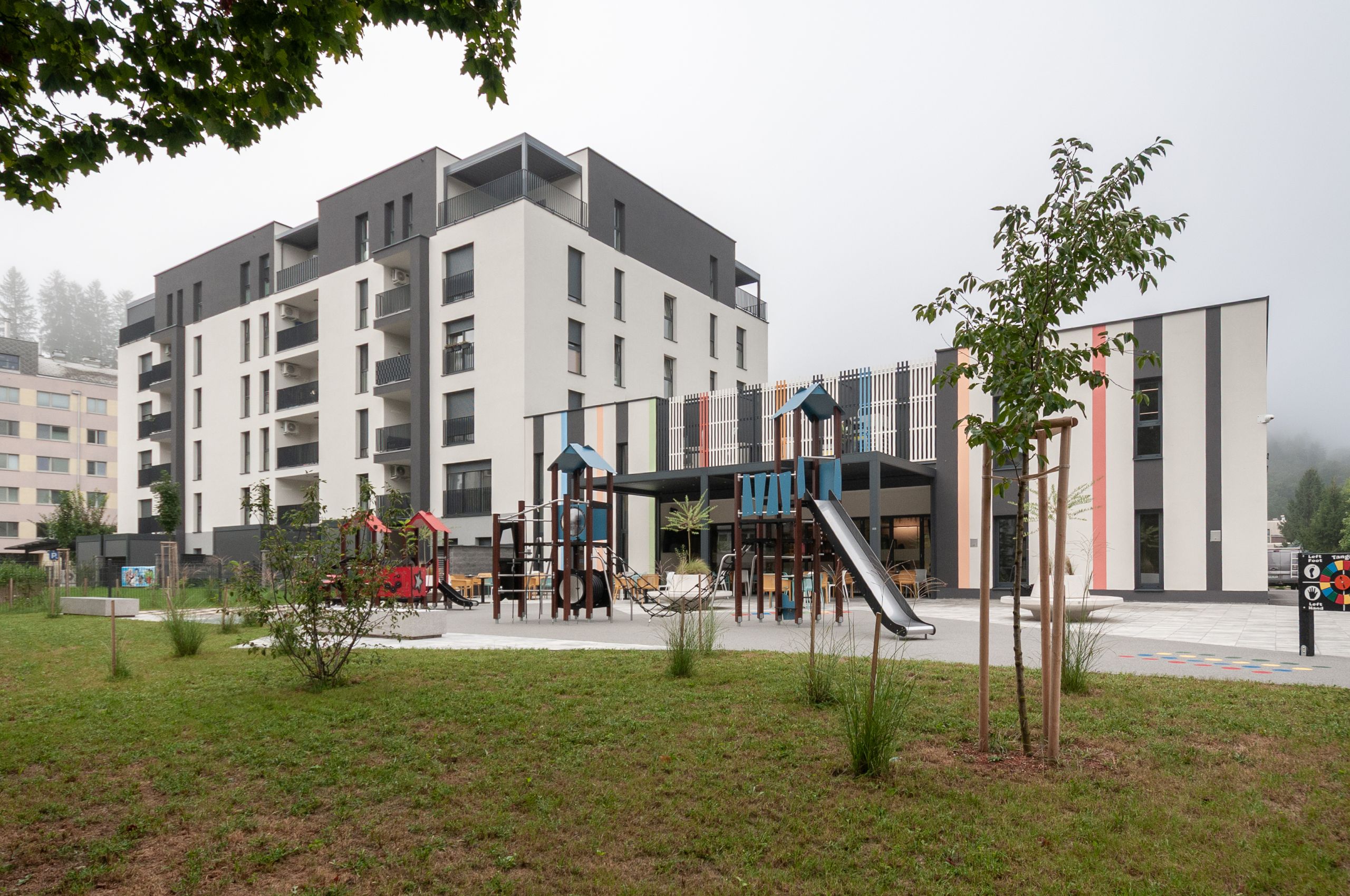 V središču stanovanjske soseske v Litiji smo na mestu prej porušenega pritličnega trgovskega objekta zasnovali poslovni objekt s fitnesom, otroško igralnico in gostinskim lokalom, ki se odpira na bližnji park z javnimi površinami. Objekt se programsko navezujejo na bližnji vrtec ter obstoječo stanovanjsko sosesko. Poleg poslovnega objekta smo zasnovali še večstanovanjski objekt Maistrova.